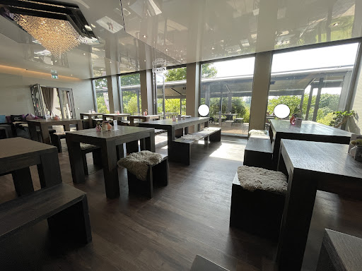 Das Ambiente ist modern aber unbequem. Harte Holz-Sitzbänke ohne Polster (nur dünne, durchgesessene Fell-Lappen) und Rückenlehnen.