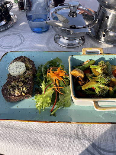Read moreAn sich schöne Location mit Außenterrasse, die bei schönem Wetter bestimmt nett ist und einen schönen Ausblick ins Grüne bietet. Dennoch muss der Rest passen, und daran muss man noch arbeiten. Erster Eindruck: mit Fett verschmierte Speisekarten, der Tisch: semi-geputzt. Speise- und Getränke-Karte umfangreich, aber zu ordentlichen Preisen (Tab water 4€). Das eigentliche Essen kam nach 35 min. Davor wurde mehrfach nachgefragt, ob man weitere Getränke bestellen möchte. Dem Kellner sind aber die schmutzigen Warmhalteplatten oder der Staub auf den Tischlampen nicht aufgefallen. In einer unserer Warmhalteplatten lag noch der Zahnstocher des Vorgängers. Sonst gab es noch Saucen-Spritzer von den vorherigen Bestellungen. Das Essen war eher durchschnittlich. Zu viert lag die Rechnung bei 130 €. Der restliche Abend daheim war bei 3/4 mit...