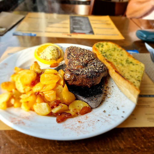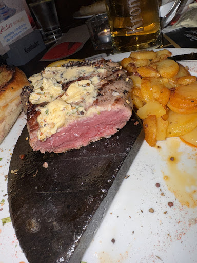 Read moreUnser perfekt gegartes Steak konnte leider nicht über die Unfähigkeit des Personals hinwegtäuschen. Erst saßen wir sehr lange, wartend auf eine Service-kraft, dann wurden die Hälfte unserer Getränkebestellung vergessen und als ich meine Vorspeisen-Suppe fast aufgegessen hatte kam auch schon der Hauptgang. Wir hatten uns auf einen schönen besonderen Abend in geselliger Runde gefreut. Der Nachbartisch machte es aber unmöglich. Ein offensichtlich russisches Trio beschallte unter anderem nicht nur uns mit einheimischen Musik aus ihrem Handy. Welches aber die Kellnerin nicht störte. Auch unsere leeren Gläser wurden nicht beachtet, sondern es war wichtiger die Aschenbecher und Karten auf den umliegenden Tischen einzusammeln. Auf meine Bestellung nach einem weiteren Getränk bekam ich nur ein müdes und nicht wirklich interessiertes lächeln. Nachdem wir aufgegessen hatten, ja die Steaks waren wirklich sehr gut und der Lavastein hielt es schön warm, saßen wir geschlagene 45 Minuten vor leeren Tellern und Gläsern. Die vorbei-huschende Service-kraft fand es wichtiger den Tisch unserer musikalischen Tisch'Nachbarn abzuräumen, die schon lange gegangen waren, als uns nach einem weiteren Getränk oder ähnliches zu fragen. Wir hätten gerne noch etwas bestellt aber es war ja niemand da! Als es mir reichte ging ich ins Lokal um zu bezahlen. Dort fand ich EINE Thekenkraft, EINEN Chef und ZWEI Kellnerinnen die am Handy spielten! Beim umsehen konnte ich weitere 5 Gäste im gesamten Lokal ausmachen. Stress? Überarbeitet? Nicht mein Problem. Auch der ausgegeben "Kurze" vom Chef, der unsere Bestellung vergessen hatte konnte über diese Blamage und Unfähigkeit nicht hinwegtrösten. Das zögerliche herausgeben meines Wecheselgeldes in Erwartung eines Trinkgeldes fand ich als erheiterden...