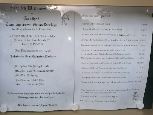 Wir waren auf der Durchreise und haben im Gasthof " Bergquell" übernachtet. Nach einem sehr freundlichem Empfang durch den Hausherren und Einweisung in unser gemütliches Zimmer in der Unterkunft, suchten wir ein gemütliches Lokal um zu Abend zu essen und landeten nach ca. 5 Gehminuten im " tapferen Schneiderlein " . Von der familiären Umgebung, dem herbstlich geschmückten Ambiente und der Freundlichkeit der Bedienung waren wir begeistert. Die Speisekarte bot gute altdeutsche Küche zu vernünftigen Preisen an. Die von uns bestellen Speisen kamen in reichlichem Umfang und sehr schmackhaft auf den Tisch. Trotz gut besuchter Gaststätte war der Service aufmerksam und schnell. Wir werden auf alle Fälle diese gut geführte Lokalität wieder besuchen wenn wir in der Nähe oder in Klosterfeld sind. Vielen Dank für den schönen Abend und macht weiter so.