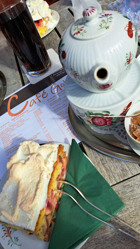 Read moreDer Stern (also ein Pluspunkt) ist für die Anrichtung des Kaffees auf einem kleinen Tablett mit einem Gläschen Wasser. Nicht zufriedenstellend finden wir das Preis- Leistungsverhältnis. Dass ein Kaffee auf der kleinen Terrasse fast 5 Euro kostet und das Stückchen Kuchen dazu fast 4 Euro, bedeutet dass eine Familie hier eine ganze Stange Geld lassen muss für einen kleinen Imbiss. Da auf den Tischen Zuckerstreuer mit braunem Zucker standen, glaubten wir eine Chance auf guten und möglichst gesunden Kuchen zu haben. Dem war nicht so ... Der Kuchen ist offensichtlich mit den gleichen billigen Zutaten gebacken worden wie in den günstigeren Cafés. Gut erkennbar mit Auszugsmehl und penetrant heraus zu schmecken mit künstlichem Aroma. Der Genuss des Käsekuchens ist darum leider nicht folgenlos geblieben. Die Servicekraft hat mit ihrem gezwungenen und unechten Verhalten nicht zu einem Wohlgefühl beigetragen, sondern ein Programm abgespult, wie es in solchen "Touristenfallen" üblich ist und war für konstruktive Kritik...