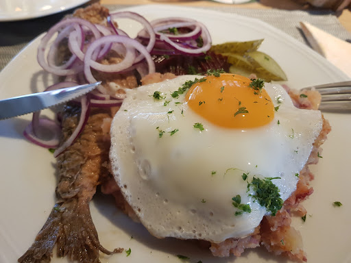 Das Essen hat uns leider gar nicht geschmeckt. Mein Mann und ich hatten Labskaus, was mehr Kartoffelstampf war. Das Labskaus wurde in einer Schüssel angerichtet, dazu eine weitere Schüssel mit Rollmops, Roter Beete etc und dann noch ein Teller, wo man das Essen drauf tun sollte. Sorry, aber 3 Teller für ein Gericht ist zu viel und dadurch war der Tisch überladen.