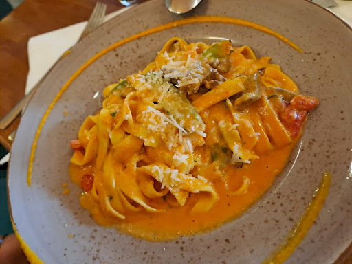 Die Qualität des Essens war wirklich hervorragend. Wir hatten eine Pizza, ein Pastagericht und Pizzabrot. Das Pizzabrot war sowie die Pizza lecker. Der Rand war schön hoch gebacken und der Teig hat Blasen geworfen. Bei dem Pastagericht wäre etwas mehr Gedöns drin (Kirschtomaten, Zuckerschoten und Rinderfilet) gut gewesen. Das Essen kam aber relativ zügig nach der Bestellung und war auch heiß. Der Gruß aus der Küche war ging so... Baguette mit Olivenöl und Creme di Balsamico aus der Flasche.