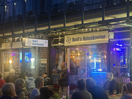 Wir suchten an einem gemütlichen Abend einen schönen Ort um noch einen Cocktail zu trinken. Vorher kauften wir uns ein Bier und gingen nun zu Rudis Hafenkneipe. Wir Warteten davor um noch unser Bier auszudrinken. Währenddessen studierten wir nun die Karte. Plötzlich kam ein junger Mann und sprach uns an. Es stellte sich mach unserem mehrmaligen Fragen heraus, dass er der Kellner ist. Wir fragten ihn was er uns empfiehlt. Auf diese Frage antwortete er sehr spöttisch, dass er alles empfiehl. Daraufhin suchten wir uns einem Platz. Da wir 7 Personen waren stellten wir uns noch einem Tisch heran. Der Kellner kam sofort zu uns gerannt und schrie uns laut an, dass wir ohne seine Aufforderung keine Tisch bewegen dürfen. Wir entschuldigten uns und gaben die Bestellung auf. Wir bestellten 7 Cocktails. Als wir damit durch waren sagte er zu uns, dass das Bier (wo in einem Becher nur noch 100 ml drin waren) ausgedrunken werden musste. Es wurde ausgedrunken. Der Kellner wurde nun wieder laut und sagte, dass es hier Gesetze gibt an die wir uns halten müssten und dass er auf unseren Umsatz nicht angewiesen ist. Wir gingen.