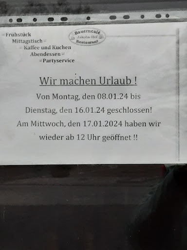 Read moreJakobshof macht Werbung für Ihren Eiskaffee..... 🤔dieser war einfach nur pfui... normaler Filterkaffee wurde wohl morgens gekocht und kühlgestellt... bei Bestellung wird dann Speiseeis hinzugefügt ,die Sahne obendrauf flockte... echt war nicht lecker ... als wir es erwähnten wurde darauf nicht eingegangen...weil ich so enttäucht war ,bestellte ich mir einen ganz normalen Kaffee.. war wohl Kaffee aus der Thermoskanne... bäh...als ich daraufhin einen Kaffee aus dem Kaffeevollautomat bestellte war dieser dann endlich gut.... Fazit: EISKAFFEE UND ALTER KAFFEE sind echt die Krönung ... nie "WIEDER BAUERNCAFE Jacobshof " ach ja... Für Eiskaffee der schmeckt bezahle ich gern 5,50€ auch für frischen Kaffee bezahle ich gern 3,50€ ... Was wirklich gut war.. das Wasser aus der Flasche... dabei kann man nix...