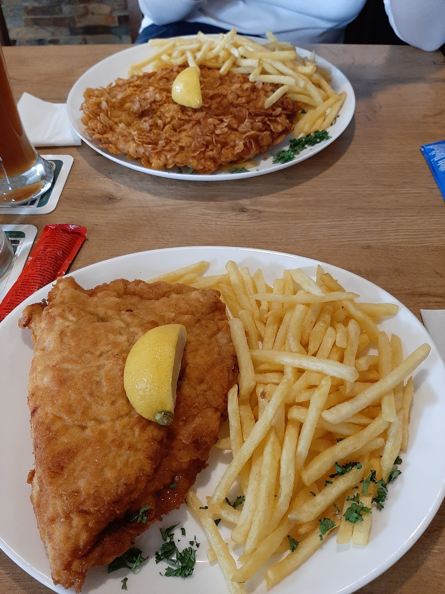Read moreDas Gasthaus "Zum Schiffla" ist sehr rustikal gehalten und der Parkplatz im Hof lädt Motorräder nicht gerade zum Parken ein. Ringsum stehen aber dennoch Parkplätze (gegen Gebühr) zur Verfügung. Die Terrasse ist jetzt in Coronazeiten mit 35 Personen belegbar (inwieweit noch andere Kapazitäten draußen möglich sind, war uns nicht bekannt). Wir schwankten bei der Vergabe der Sterne zwischen 4 und 5 Sternen, da für uns auch das Ambiente (das Auge isst mit) eigentlich wichtig ist. Auf einer Motorradtour legt man aus unserer Sicht aber andere Schwerpunkte. Daher vergeben wir trotzdem 5 Sterne! Warum? Weil die Bedienung superfreundlich agiert und sich um jeden kümmert und nachfragt, ob alles passt. Schon im Vorfeld bei einem Telefonat hat sie darauf hingewiesen, dass man auch zu Zweit einen Tisch reservieren soll. Den Grund haben wir vor Ort feststellen dürfen - zwischen 12:00 und 13:00 Uhr ist die Terrasse, auch unter der Woche, ausgebucht und im Innenraum sitzen ebenfalls Gäste (Handwerker, Radfahrer etc.). Das Essen ist superlecker und absolut frisch zubereitet. Die Wartezeit auf das Essen war daher voll in Ordnung. Die Schnitzel (Cordon Bleu Schiffla - gefüllt mit Camembert und Preiselbeeren sowie das Cordon Bleu Spezial - gefüllt mit Schinken, Käse, Zwiebel, Senf und Meerrettich) sind sehr saftig, kross gebraten und wirklich riesengroß. Geschmacklich waren die Schnitzel ebenfalls ausgezeichnet. Das Preis- Leistungsverhältnis ist konkurrenzlos. Wir werden auf jeden Fall wieder zum Schiffla fahren, weil wir uns ein so ausgezeichnetes Essen nicht entgehen lassen. Da nehmen wir auch eine Anfahrt von 80 km sehr...