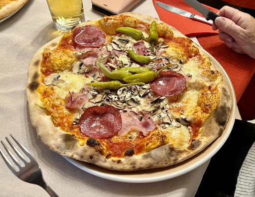 Read moreDas Preis-Leistungsverhältnis passt hier auf jeden Fall. Die "kleine" Pizza kommt einer Großen in anderen Pizzerien sehr nahe. Die Champignoncremesuppe hatte eine gehaltvolle Beilage an Champignons. Leider gehört zu der Suppe kein (Pizza)brot, wie man laut Speisekarte meinen könnte. Dafür wurde von uns im Nachhinein 4 € verlangt (trotz falscher Rechnung - s. unten und Trinkgeld) Ansonsten waren die Pizzen sehr lecker und gut belegt. Parkplätze gibt es hinter dem Haus. Wer schlecht zu Fuß ist, sollte wissen, dass die Pizzeria im 1. Stock liegt. Tische für 2 Leute gibt es scheinbar nicht, selbst wenn man reserviert hat. An unseren Tisch wurde noch ein Pärchen gesetzt (die scheinbar nicht reserviert hatten) - wir wurden aber gefragt, ob es für uns ok ist und es war noch auf jeder Seite ein Stuhl frei (6er-Tisch). Den nächsten Stern verlor die Pizzeria an die Rechenkünste des Kellners. Er rechnete uns eine Rechnung von 28 € zusammen. Als ich einen Beleg wollte, stand aber nur eine Rechnung von 27,20 € drauf. Er gab sie mir ohne ein Wort der Entschuldigung. Hier geht es ums Prinzip und sowas ist für mich dreist. Aber an einer Person kann man nicht eine ganze Pizzeria messen, deswegen bekommt die Pizzeria von uns nochmal...