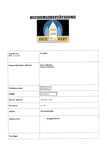 Wir wechseln mit den Gasthäusern immer wieder durch und probieren auch viel neues aus. Und dieses mal wollten wir im Gasthaus BräuWirt einkehren. Dazu habe ich angerufen um zu reservieren. Ich habe angegeben, dass wir uns offiziell um 19:30 Uhr treffen, manche schon früher kommen, in etwa 20 bis 30 Personen sind, alle essen und trinken und ob wir anschließend noch länger sitzen können. In der Regel ist es so, dass nach dem Essen noch die eine oder andere Flasche geleert wird.