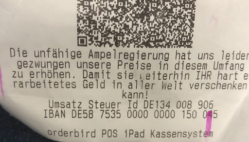 Vor allem nicht gestützt durch Tatsachen . Keine Chance dem zu entkommen als Plakat vor der Gaststätte auf der Speisekarte und Kassenbon wird man damit konfrontiert.