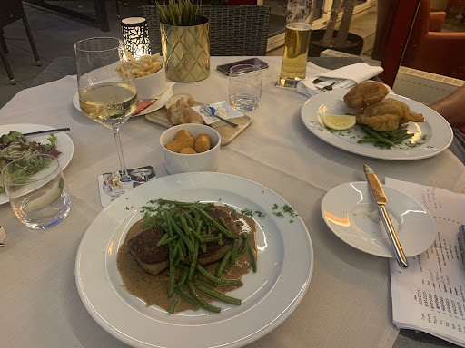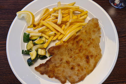 Der Service war zuvorkommend und nett. Wir hatten ein Schnitzel mit Pommes und ein Raumsteak mit Kroketten und Gemüse. Es verging keine 30 Minuten, dann stand das essen auf dem Tisch. Das Schnitzel war vom Geschmack ganz okay. Das Raumsteak hatte ich medium bestellt bekommen habe ich durch. Wir haben den Kellern darauf hingewiesen. Er hat sich viel Mal entschuldigt und hätte mir auch ein neues gebracht was ich aber ausgeschlagen hatte, da ich mit meiner Frau zusammen essen wollte und wir danach noch einen Termin hatten. Der Ausblick ist natürlich sehr schön auf das Dreiländereck und den Rhein. Es ist ein okay es Restaurant wo man eher ein kühles Getränk zu sich nimmt und die Aussicht auf der Terrasse genießen kann und dazu eine...