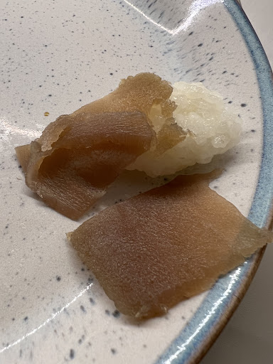 Read moreDas gelieferte Sushi überzeugt absolut nicht. Wir haben grau-grünlichen Thunfisch mit schwammiger Textur erhalten (siehe Foto). Dann waren noch alle Maki-Rollen und Nigiri winzig (etwa halb so groß wie ich das von anderen Sushi-Restaurants kenne). Vielleicht gibt es im Restaurant selbst bessere Qualität, aber das was geliefert wurde war das schlechteste Sushi, das ich je hatte. Immerhin war die Lieferung sehr pünktlich,...