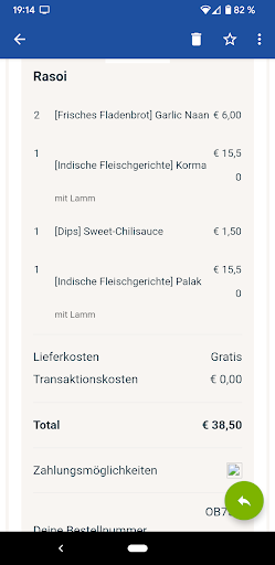 Read moreWe ordered take out from Rasoi this evening using Lieferando. Our order arrived and not only did we get everything we ordered, but we got two extra dishes. I called the restaurant to ask if it belongs to another customer and they said to just keep it.