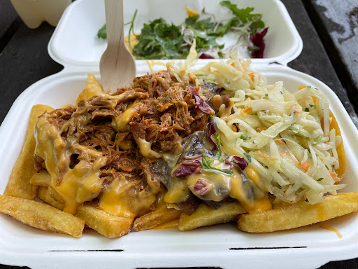 Sehr hipper "Street Food"-Laden, der sich nahtlos in die junge, etwas linkslastige Stadt einfügt (viele Punks, Hippies, grünhaarige Pärchen, Refjuschies, Künstler plus entsprechende Schmierschriften allerorten). In der langen Schlange fanden sich barfüßige Freigeister, Vegane-Pommes-Besteller und coole, schwarzgekleidete Studenten. Das Geschäft selbst definiert sich über lustige Wortspiele, Flohmarktlampen, Fritz-Cola und nicht weniger als zwölf Mayosorten. Natürlich alle regional und selbstgemacht. Das Personal gibt sich jung, gut gelaunt, flotte Sprüche auf den Lippen, in diesem drolligen Akzent. So stellt der Gitterrost unter der Ausgabe sein "Trinkgeldfach" dar.