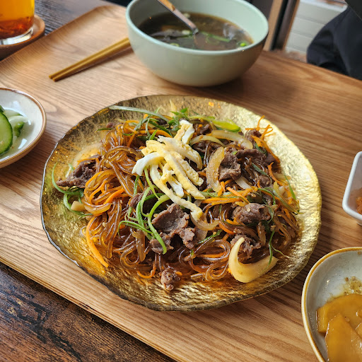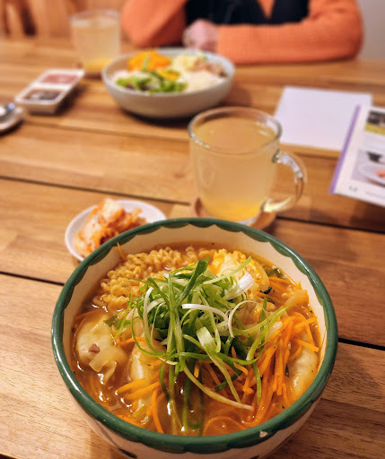 Read moreDas Restaurant ist sehr geschmackvoll eingerichtet, tolle Möbel, familiäres Ambiente mit der Küche hinter der Theke. Man wird herzlich Empfangen und Verabschiedet. Man fühlt sich sehr wohl. Auf der Karte stehen nur wenige Gerichte, was die Wahl einfacher macht. Aber ich muss zugeben, daß ich vom Essen etwas enttäuscht war. Meine Nudeln waren keine besonders leckeren, eher wie aus einem Schnellgericht und die Zutaten waren Simpel. Ob es so traditionell ist, weiß ich nicht, das gebe ich zu, aber ein bißchen mehr Pepp hätte ich mir gewünscht. Das Gericht meiner Begleitung war auch nur eine einfache Zusammenstellung an Zutaten ohne Pepp - Reis, Ei, Karotten, usw. mit Soya zum Würzen. Obwohl die koreanische Küche doch auch viele Würzsoßen haben, oder? Was etwas schade war, das es kein Soju Bier oder Magdogli gab - nur alkoholfreie Getränke. Aber in Ordnung, wenn der Betreiber das so möchte - Ich habe Kimchi zu meinem Essen bestellt, was aber leider nicht fertig fermentiert gewesen ist. Vielleicht gerade mal ein paar Tage jung und damit war der Kohl noch hart und quasi roh, was zu etwas Bauchweh und Blähungen im Anschluss führte. Das sollte nicht sein, Kimchi sollte nicht so kurz fermentieren, 1-2Wochen müssen es schon sein auch, wenn das bedeutet auf großen Vorrat vorzubereiten oder zuzukaufen. Die verschiedenen Tees sind sehr...