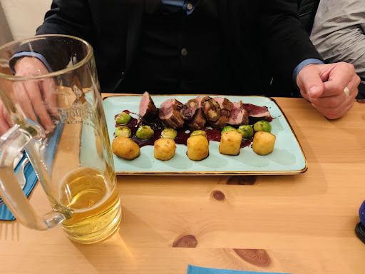 Essen: Der Gruß aus der Küche war ein fluffiges Baguette mit einer köstlichen, hausgemachten Senf-Honig-Creme, die genau das richtige Maß an Intensität hatte. Ein perfekter Einstieg! Mein Hauptgericht war ein Medium-Rare Steak mit Pommes. Geschmacklich war das Steak hervorragend, wenn auch der A-Point knapp verfehlt wurde – es war etwas zu lange gegrillt und daher fast durch. Die Pommes hingegen waren auf den Punkt, knusprig und gut gewürzt. Ein weiteres Highlight war der Flammkuchen nach Elsässer Art, der mit Käse überbacken wurde. Der Teig war von perfekter Festigkeit, und die sahnige Creme harmonierte ausgezeichnet mit den restlichen Zutaten.