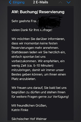 Sehr geehrte Damen und Herren, wir hatten fest geplant, in Ihrem Restaurant zu essen, und Ihnen bereits eine Woche im Voraus per E-Mail eine Anfrage zur Tischreservierung geschickt. Ihre Antwort ließ uns jedoch wissen, dass eine feste Reservierung nicht erforderlich sei und wir einfach spontan vorbeikommen könnten (siehe Anhang). Auf dieser Grundlage haben wir unseren Besuch bei Ihnen vorbereitet. Kurz vor unserem geplanten Besuch riefen wir noch einmal bei Ihnen an, um alles zu bestätigen. Zu unserer Überraschung und Enttäuschung wurde uns dann jedoch mitgeteilt, dass eine kurzfristige Anmeldung nicht möglich sei und kein Platz mehr verfügbar wäre. Die widersprüchlichen Informationen – zunächst, dass keine Reservierung nötig sei, und dann, dass spontan kein Platz mehr verfügbar sei – sind äußerst frustrierend. Eine klare Information von Anfang an, dass Sie ausgebucht sind und keine Reservierung möglich ist, hätte uns sofort Bescheid gegeben und die Gelegenheit eröffnet, uns nach Alternativen umzusehen. Stattdessen wurden wir durch unklare Kommunikation unnötig hingehalten. Wir erwarten eine Erklärung zu dieser mangelhaften Informationspolitik und hoffen, dass sich in Zukunft eine professionellere und transparentere Kommunikation bei Ihnen durchsetzt.