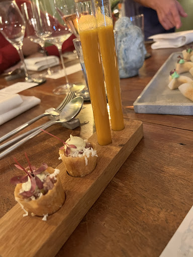 Read moreDie Atmosphäre, der Service, die angenehme Musik und vor allem das gute Essen bewerte ich mit 4-5 Sternen. Die Qualität der ausgewählten Gerichte war sehr gut und war auch fürs Auge sehr schön angerichtet. Was ich persönlich nicht so gut fand und deshalb bewerte ich alles zusammen mit nur 3 Sternen, war, dass man nur nach Menü essen kann und zu einer festgesetzten Zeit vor Ort sein MUSS. 18.30 Uhr musste man da sein, 19 Uhr begann das ausgewählte 4-6 - Gänge Menü. Hat also ein Gast nur das 4-Gänge Menü ausgewählt, der Rest der Gäste aber ein 6-Gang Menü, muss man warten, bis die anderen Gäste ihre 2 Zwischengänge erhalten haben. Die Zeit dazwischen, vor allem bis zum Dessert, ist einfach zu lang. Man fühlt sich beim Warten auf den letzten Hauptgang ein bisschen verloren, denn jeder Mensch hat eine andere Ess-Charakteristik, manche zelebrieren jeden Bissen, was vollkommen ok ist, andere wiederum sind schneller beim Essen. Das sollte am Ende den Gästen, die nur 4-Gänge bestellt haben, nicht zugemutet werden. Ich fände es besser, wenn das bestellte Menü so serviert wird, wie man es bestellt hat. Das nur 1 Koch in der Küche kocht, dafür kann kein Gast etwas. Ebenfalls fand ich die überteuerten Weine ein Wahnsinn. Hier kann man, wenn überhaupt, nur ein Glas bestellen. Der Abend war im Großen und Ganzen zu teuer, dafür, dass am im Gleichtakt essen musste. Schade, aber wer kann sich heutzutage einen Abend mit leckeren Essen für 230 € leisten?? Eher die...