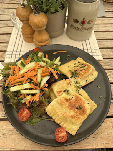 Zu Essen hatten wir das Kochkäseschnitzel und Spargelmaultaschen. Die selbstgemachten Spargelmaultaschen waren gut. Das Kochkäseschnitzel war bisher das schlechteste, was ich in einem Restaurant serviert bekommen habe. Das Schnitzel war wahrscheinlich einen Moment zu lange drin und die Pommes waren nicht lange genug drin. Schlechteres Pommes habe ich noch nie bekommen. Der Kochkäse ist Durchschnitt. Von meiner Begleitung wurde mir gesagt, dass eigentlich selbstgemachte Pommes angeboten werden bzw. in den anderen Rezensionen habe ich das ebenfalls teilweise gesehen (ähnlich Steakhouse Fries).
