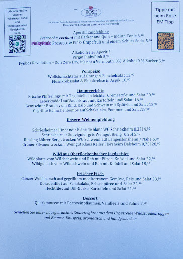 Anyone visiting the north Baden region will find Zur Rose in the beautiful hilltop village of Oberflockenbach [over the snow stream] a jewel.|||| The rooms, rates, food, service, ambience, friendliness all add up to an experience that was for me unforgettable. Despite the hilltop location, this is only twenty minutes from Heidelburg, Weinheim, and Mannheim. |||| The Schmitt family have been operating Zur Rose for a century, and it shows. The handmade breakfast buffet is worth the stay in itself. The evening meals in the restaurant are lovely, and the bar prices very affordable.|||| The rooms have ensuite, telephone,TV, balcony, luxurious bedding, and gorgeous scenery.|||| There are buses at the front door regularly, direct to Weinheim station, and people driving have plenty of parking and only a short drive to the Bergstrasse and autobahn. This is an area of vineyards, castles, rivers, and pastures, but is very close to big-city amenities. |||| To all the Schmitt Family, thank you for your fantastic service, your friendly help, and lovely meals. |||| ...