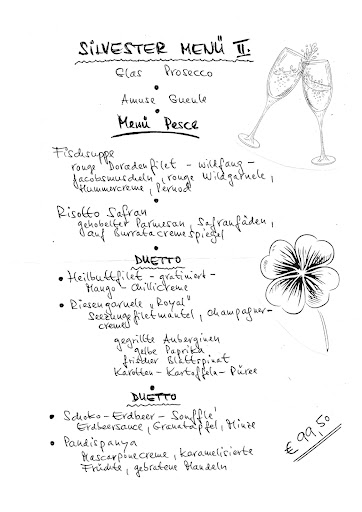 Wir hatten das Silvester-Menü aufgrund des schriftlichen Angebots (siehe Foto) für drei Personen zu jeweils 99,50 EUR bestellt. Nachdem die zwei Fischgerichte serviert waren, bemerkten wir, dass es gar keine DUETTO waren. Es fehlten die Riesengarnele „Royal“ mit Seezungenmantel und die Champagnercreme, wie es in dem Menü Pesce aufgeführt war (siehe Foto Fischgericht). Wir reklamierten den Fall und mußten etwa ½ Stunde auf die fehlenden Teile des Fischgerichts warten. Die dritte Person speiste dadurch das Fleischgericht alleine, was auch sehr ärgerlich war.