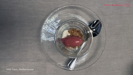 Vor dem pfiffigen und hübschen Nachtisch mit Kirsche und Schokolade steht nur noch das Predessert (Zitroneneis Und Holunder-Espuma), ein weiteres Sorbet als Petit Four beendet das Erlebnis.
