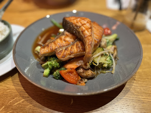 Zum Wichtigsten: Wir bestellten eine Tofu Bowl sowie den gebratenen Lachs auf Gemüse und waren von der Art der Anrichtung und des Geschmacks äußerst positiv angetan. Der Geschmack war hervorragend und intensiv, man konnte deutlich schmecken, dass hier frische Zutaten verarbeitet wurden. Der Lachs war butterweich zubereit und saftig (leider keine Selbstverständlichkeit, viel zu oft erlebten wir in Restaurants zu lange gebratenen Fisch). Zudem waren die Portionen so dimensioniert, dass wir hinterher kein Dessert mehr geschafft haben.