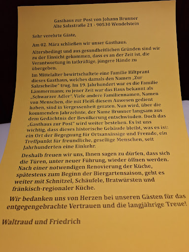 Read moreImmer wenn wir im Spätsommer/Herbst in Nürnberg zur Messe sind wohnen wir im Hotel am Ludwigskanal schräg gegenüber der Gaststätte zur Post von Johann Brunner. Es handelt sich bei der Gastatätte um ein hervorragendes Restaurant mit exzellenter fränkischer Küche. Die täglich wechselnde Speisekarte ist sehr einfach gehalten und es gibt immer „nur“ ca. 10 Gerichte zur Auswahl, was aber völlig ausreichend ist. Egal welches Gericht man bestellt, es ist immer ein absoluter Hochgenuss. Alles ist frisch zubereitet! Zur Gaststätte gehört sogar eine eigene Schlachterei. Egal ober Leberknödel oder Schäuferle ob Cordon Bleu oder einfach Schnitzel, alles ist saulecker. Die Salate sind super frisch, die Bedienungen ( die alle schon seit mehreren Jahren dort arbeiten) sind alle durch die Bank weg eine Wucht. Die Kürbiscremesuppe ist eine absolute Eins! Garantiert keine Tiefkühlkost oder fix frittierte Fertiggerichte.