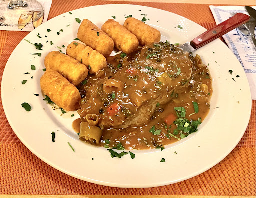 Die Kroketten waren knusprig und sehr schmackhaft. Das andere Gericht, ein Souvlaki, war zusammen mit dem Tzaziki und den groben Zwiebeln ebenfalls sehr lecker und genau richtig für ein griechisches...
