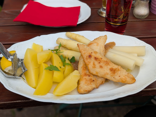 Beim ersten Besuch saßen wir im wunderschön angelegten Biergarten, umgeben von alten Bäumen und viel Ruhe. Das Fläminger Bier vom Fass war angenehm frisch und perfekt gezapft. Kulinarisch wurden wir rundum überzeugt: Der Spargel war exakt auf den Punkt gegart – zart, aromatisch, mit genau dem richtigen Biss. Das dazu gereichte Schnitzel war außen goldbraun und herrlich knusprig, innen wunderbar saftig – so, wie man es sich wünscht.