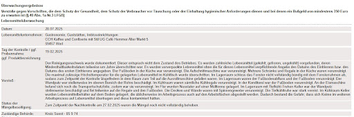 Auch die Kühltemperatur lag über der zulässigen Höchstgrenze, was bei empfindlichen Lebensmitteln problematisch ist. Laut Kontrollangaben waren die Mängel bei der Nachkontrolle Ende Februar 2025 noch nicht vollständig behoben.