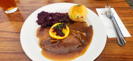 Das Getränk war schnell bestellt und serviert, bis zur Essensbestellung dauerte es etwas, der Laden war voll. Ich entschied mich für Hirschgulasch mit Rotkraut und böhmischen Knödeln. Grundsätzlich war es solide gekocht. Das Gulasch war lecker, das Rotkraut hausgemacht, die Knödel trocken, ja sogar etwas kross. Das ist unschön! Dazu biss ich beim ersten Bissen auf ein Pimentkorn. Das passiert, muss ich halt aufpassen. Weitere 3 Körner habe ich dann vorher aussortieren können. Passiert alles, gerade wenn man große Mengen kocht. Aber es gibt schon Möglichkeiten es zu vermeiden. Also ein Stern Abzug für die trockenen Knödel und die Pimentkörner.