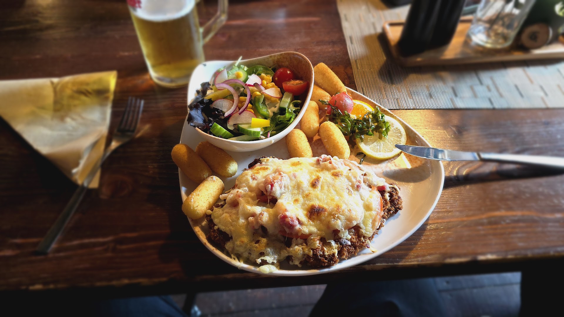 Das Restaurant selbst bietet ein uriges und mittelklassiges Ambiente - nicht luxuriös, aber auch nicht heruntergekommen. Es ist genau das Richtige für einen gemütlichen Abend. Geschmacklich waren die Hauptspeisen durchweg positiv, besonders das Schnitzel hat überzeugt. Mein Hähnchengericht war lecker, aber nicht herausragend. Ein kleiner Kritikpunkt wäre die Menge an Sauce und Dressing, die bei unseren Gerichten etwas spärlich ausfiel.