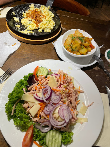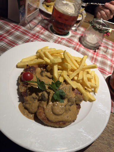 Atmosphere is perfect, the wooden elements, farmers tools and decor generally really do add to the “German” vibe, giving it that unique look you are most likely searching for, just the way we did. The food, to me, is just perfect… for me this was a 30 minute drive, in a one hour driving range, this is by far the best restaurant I could go to if it comes to German Cousine. I’ve already been here once and sadly did not take a picture of the Käsespätzle Pfanne, which is more than pleasing to the eye. Today, as you can see below, I decided on a Jäger schnitzel. It comes with fries and a bread coating, which in this case is a bretzel coating. It might not look like much but do trust me, you will leave with a full belly. The price is just fine, not cheap but not too expensive… the only thing I wouldn’t be able to talk big about would be the service. They do not check very often, so it might occur that your empty plate does wait about 10 minutes until taken away, which is a bit questionable in a small establishment like this. I did see one of the waiters just standing there for a bit, to be fair she was younger, but why not just go around and ask if everything’s fine? Besides that, perfect establishment, recommend it with all...