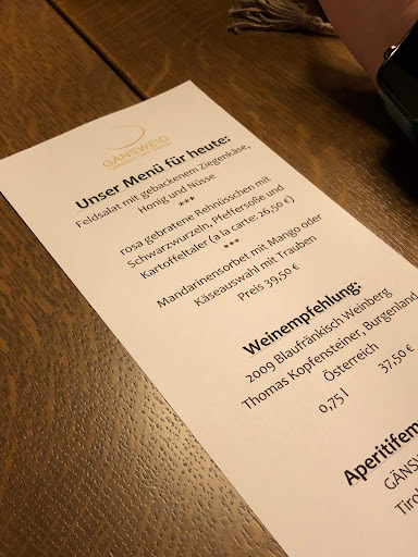 Read moreIch hätte nicht damit gerechnet, in Wertingen ein so gutes Restaurant zu finden. Zugegeben, preislich ist das Gänsweid auf jeden Fall als gehoben anzusehen, aber die Preisleistung ist absolut in Ordnung und entsprechend voll war es bei uns auch (daher unbedingt vorher reservieren). Ich hatte Rehnüsschen mit Schwarzwurzel, Pfeffersoße und Kartoffeltaler von der Tageskarte für 26,50 Euro. Das Reh war perfekt gegart und super zart, die Soße ein Geschmackserlebnis. Als Nachtisch hatten wir noch Mousse au Chocolat und sehr leckere Apfelküchle. Meine Begleitung war von ihrem Essen (Kabeljau, Fisch können sie also auch) ebenfalls komplett begeistert. Die Räumlichkeiten sind auch schick und trotzdem gemütlich, den Service empfand ich als freundlich und bodenständig. Ich würde das Restaurant unbedingt weiterempfehlen. Wenn man sich in der Gegend einfach mal ein "etwas besseres Essen" gönnen will, ist man hier genau richtig :) Ich hoffe, dass ich noch ein paar...