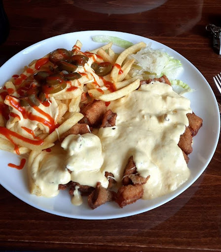 Jetzt kommt leider der unangenehme Teil: Das große Schnitzel, welches Potenzial hatte, wurde in wirklich tiefschwarzem Fett in der linken Einzelfriteuse ausgebacken, angeschnitten und darin weiter frittiert, sodass es komplett nach altem Fett schmeckte. Die Zwiebeln wurden frisch auf der Grillplatte zubereitet und waren essbar. Die dazu bestellten Bratkartoffeln trieften vor Fett, was leider sehr schade war.