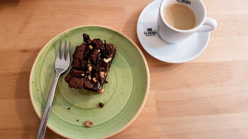 Arrived here on a rainy afternoon instead of walking another hour south to Neuendorf to the next ferry terminal on Hiddensee. Ordered espresso (2€) and walnut Brownie. Coffee was brewed by digital machine and although not piping hot, had a good smooth taste. Brownie portions size was a bit small for the price (2.90€), but big on flavour - dense bottom with dark chocolate and chunky, less dense top with caramel sandwiched between and topped with dark chocolate drizzle and chopped walnuts. Atmosphere is tidy, quiet (no music) and hushed voices. Counter server was warm and not overly jubilant. Store also sells local products, such as honey, seabuckthorn liquor and juice, bottled wine,...