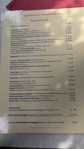 Read moreZum dritten Mal in Folge wurde ich hier erheblich enttäuscht. Das erste Mal war es der 'Handkäs mit Musik', der nicht angemacht war, eine total trockene Angelegenheit. Das zweite Mal der 'Matjes Hausfrauenart', woran jedweder Geschmack fehlte, außerdem kein Dill, keine Zwiebeln, kein Apfel... Und zuletzt der 'Salat Kirschenwäldchen': eine Handvoll Blattsalate, zwei Scheiben Gurke, eine Spalte Tomate, vier Stück(chen) Hähnchenfleisch, vier Scheiben Baguette, Kosten 10 Euro. Meine Freundin hat sich an dem mickrigen Salätchen hungrig gegessen. Dem Chef habe ich Zeichen gegeben, weil sie noch etwas dazu bestellen wollte, dieser war mit Smalltalk beschäftigt und hat uns geflissentlich übersehen. Ich habe mich nun drei Mal in Folge geärgert und werde dort nichts mehr essen. Obwohl: Pommes sollte der gelernte Koch vielleicht noch hinbekommen, einen weiteren Versuch wäre es wert. ;) Die Gaststätte ist leider seit langem die einzige Lokalität im schönen Kirschenwäldchen, und man sitzt nach dem Spazierengehen wirklich sehr angenehm. ABER: Finger weg von der...