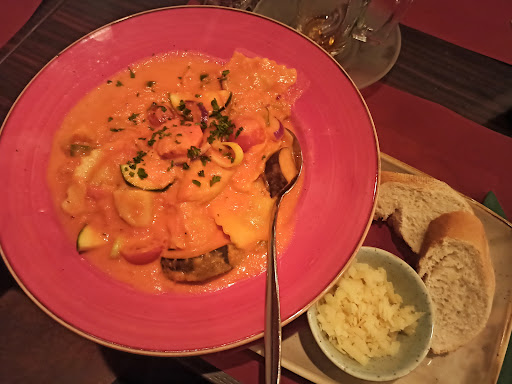 Read moreDie inneneinrichtung vom Restaurant sieht gut aus und ist modern. Allerdings nur bis zur Grenze von diesem merkwürdigen Zelt. In diesem merkwürdigen Zelt das hinten angeschlossen ist sieht es doch sehr heruntergekommen aus. Wir haben uns dort kurz vor Weihnachten einen Tisch reserviert. Wir erhielten einen Tisch im Haus aber direkt an der Grenze zu diesem merkwürdigen Zelt. Es war dort eisekalt und hat sehr gezogen und der mickrige Heizlüfter hat nichts geholfen. Wir bekamen dann einen anderen Tisch nachdem wir uns beschwert hatten. Allerdings verstehe ich hier nicht warum überhaupt Gäste so ein Tisch bekommen dort " draussen" , obwohl das Restaurant ziemlich leer war! Die Kellnerinnen waren so stark geschminkt und aufgetakelt, dass man hätte denken können Sie wären einen schminktopf gefallen oder wollten als Clown auftreten. Dementsprechend arrogant und eingebildet haben sie sich auch verhalten. Ihren Job (der unter ihrer Würde ist) haben Sie natürlich auch nur halbherzig erledigt. Ich frage mich warum man solche Leute einstellt?! Ich hatte mich ziemlich auf ein passendes weihnachtliches Gericht ( kurz vor Weihnachten) gefreut. Allerdings wurde ich auch in diesem Punkt mehrfach enttäuscht! Verschiedene Gerichte nach denen man fragte waren merkwürdigerweise ausverkauft, obwohl es erst 18 Uhr war und sie groß damit Werbung machten! Das Fleisch war noch fast blutig! Der Rotkohl schmeckt am Anfang sehr lecker, das war aber auch alles! Nachdem ich das Fleisch habe zurückgehen lassen weil es noch roh war, bekam ich mein Essen wieder. Allerdings war es dann noch ungenießbarer, weil der Rotkohl auf einmal total scharf war und das Fleisch war nun eine schuhsohle! Sogar die Spezial weihnachtsgetränke waren mehr murks als alles andere und sehr mit Wasser gestreckt (was man merkte)! Das kriege ich zu Hause alleine schon viel besser hin! Dafür braucht man nicht in ein Restaurant zu gehen! Das einzige an Essen was relativ gut geschmeckt hat war die Vorspeise (Bruschetta), Allerdings wurde diese für zwei Personen empfohlen und man bekamen nur 3 kleine Stücke!!!!! Absolut lächerlich! Zudem waren die wartezeiten alleine schon auf ein Getränk absolut unterirdisch/ viel zu lange und die wartezeit auf ein Essen noch viel länger obwohl tatsächlich im ganzen Laden nur ca. 6 Tische besetzt waren mit uns und min. 3 Kellnerinnen rumliefen!!!!! Überhaupt nicht zu empfehlen! Zudem war das ganze Essen und die Getränke auch viel zu überteuert, was schon eher eine Frechheit ist! Als Empfehlung an den Laden schließt lieber,als euren Gästen so...