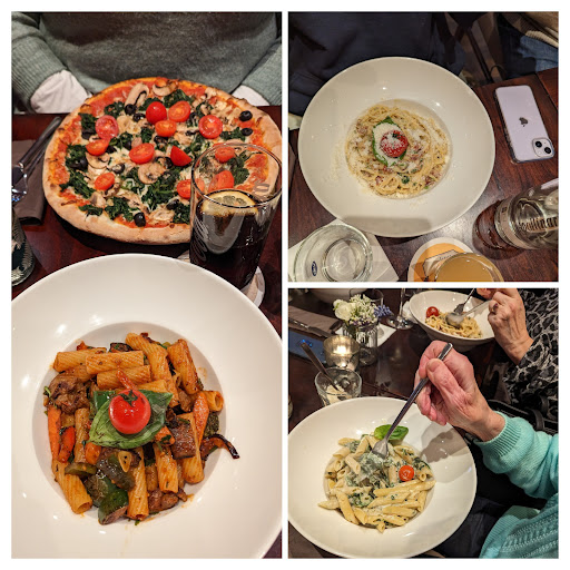 Kommen wir zum Essen: Es gab Spaghetti Carbonara, hervorzuheben ist hier, dass man gefragt wird, ob man diese klassisch nach Original haben möchte oder die übliche Variante mit Sahne - natürlich geht für uns nur das Original, Sahne hat in einer Carbonara nix zu suchen 😉 ABER hier hat der Gast eben die Wahl. Ein weiteres Gerichte waren die Penne mit Steinpilzen und Rund, Penne Spinat Gorgonzola, Rigatoni mit mediterranen Gemüsebund Rinderfiletspitzen, sowie eine vegetarische Pizza. Dazu auf Wunsch frischer Pfeffer, Parmesan und Brot. Alle Gerichte waren an sich gut portioniert, die Pizza auf jeden Fall, nur meine Rigatoni haben mir nicht gereicht 🙈 gut das die Omi von den Spinat Penne etwas übrig gelassen hat 😂 An Getränken haben sich die Damen für einen Pinot Grigio entschieden, die Omi Apfelschorle und medium bzw. stilles Wasser durfte nicht fehlen. Der Espresso danach war prima, die Crema perfekt. Insgesamt waren wir mit 148 € bei 6 Personen dabei - Preis-Leistung ist durchaus angemessen. Die Hauptgerichte bei uns lagen zwischen 11 € und 20 €.