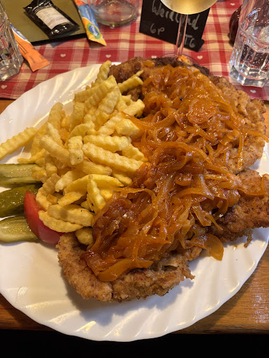 Zwei von uns hatten die große Portion (deklariert als normale Portion) und die Menge war außerirdisch. Zwei große Schnitzel, dazu eine riesige Portion Schmorzwiebeln und Pommes. Super lecker, super heiß serviert und einfach nur köstlich!