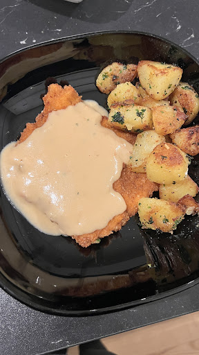Das Fleisch war qualitativ sehr gut. Allerdings wurden wir nicht nach dem Garpunkt des Steaks gefragt, was aus meiner Sicht impliziert, dass das Steak Medium serviert wird. Das Steak war jedoch Medium well - well done. Die Soße für das Schnitzel ist aus der Packung, was man bei dem Preis vielleicht noch verschmerzen kann.