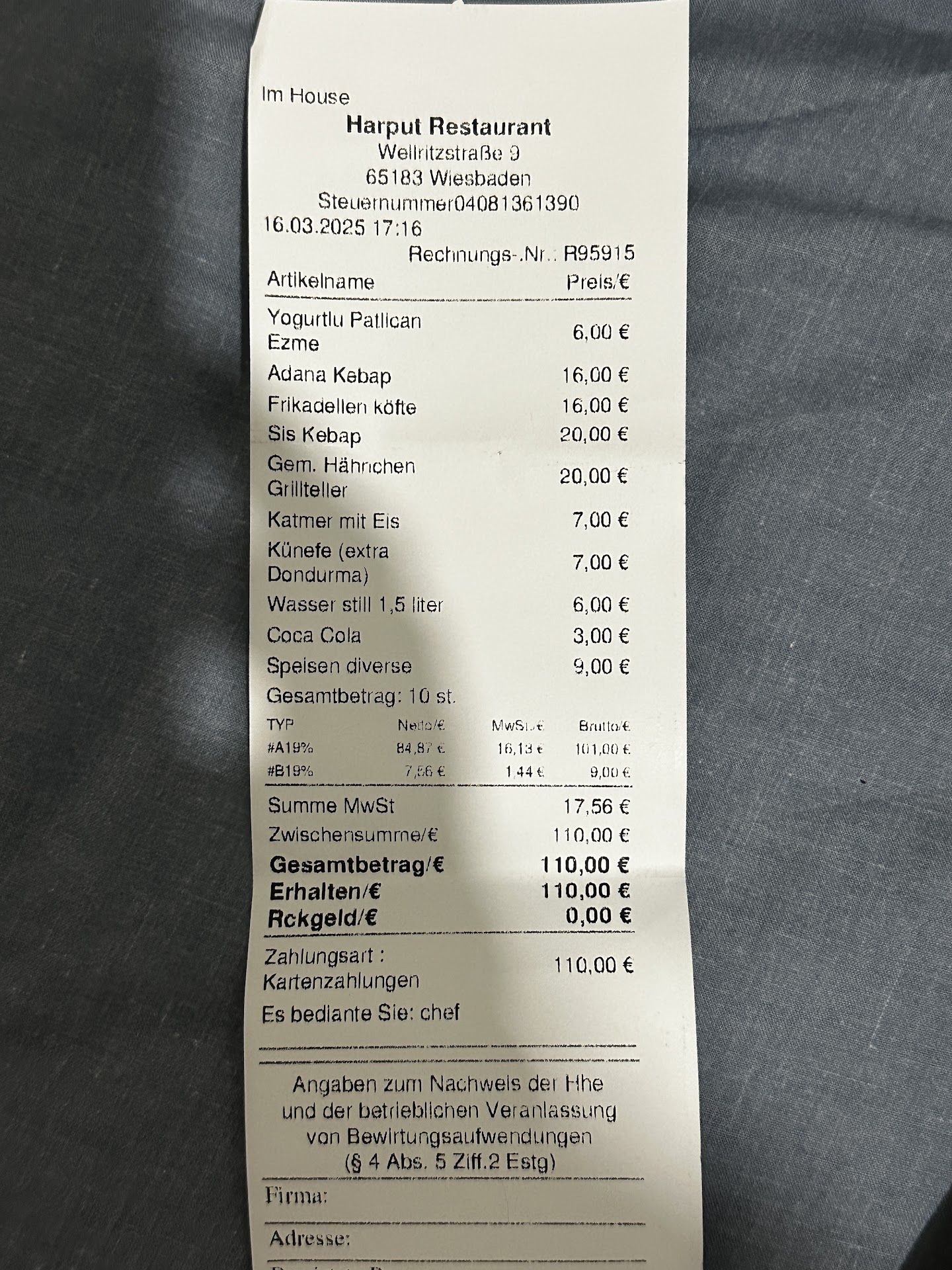 1: Yogurtlu Patlican Ezme - 6,00 € (Eggplant Paste with Yogurt) 2: Adana Kebap - 16,00 € 3: Frikadellen köfte - 16,00 € (Meatball Kofta) 4: Sis Kebap - 20,00 € 5: Gem. Hähnchen Grillteller - 20,00 € (Mixed Chicken Grill) 6: Katmer mit Eis - 7,00 € 7: Künefe (extra Dondurma) 7,00 € 8: Wasser still 1,5 liter - 6,00 € 9: Coca Cola - 3,00 € 10: Speisen diverse - 9,00 € The desserts were a big highlight of the day and god it was soo fulfilling and satisfying Im sorry i do not have the English translation of the items but it was...