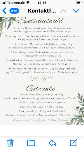 Read moreDer absolute R(h)einfall! Anlässlich einer Familienfeier haben wir für 18 Personen einen Tisch draußen auf der Terrasse reserviert. Als wir ankamen fanden wir nur eine gestresste Kellnerin vor sowie einige besetzte Tische. Personell war das Lokal völlig unterbesetzt, das sollte aber nicht an den zahlenden Gästen ausgelassen werden. Trotzdem hatten wir dadurch (anfangs) noch Verständnis für die gestresste Kellnerin. Wir mussten erstmal 30 Minuten warten, bis unser Gruppentisch gestellt werden konnte, da der Chef unsere Reservierung nicht an sein Personal weitergegeben hatte, wie sich herausstellte. Als wir uns dann endlich setzen konnten, dauerte es weitere 30 Minuten, bis unsere Getränkebestellung aufgenommen wurde, noch länger jedoch, bis wir diese bei diesem heißen Sommertag endlich gebracht bekamen. Bis unsere Essensbestellung aufgenommen wurde, saßen wir bereits 1,5 Stunden, die Kinder wurden verständlicherweise schon quengelig, da sie Hunger hatten. Das uns dann endlich nach 2 Stunden servierte Essen war teils kalt und geschmacklich teilweise minderwertig, insgesamt nichts Besonderes. Da erwartet man von einer Schlossküche in diesem Ambiente deutlich mehr! Die abgepackte, ungekühlte Salat-Mayonnaise, die den Kindern zu den Pommes gereicht wurde, war seit fast 5 Monaten abgelaufen! Wir hoffen, dass die Kinder jetzt keine Probleme mit Salmonellen bekommen. Die Kellnerin war in vielen Situationen, in denen wir was fragten oder beanstandeten unfreundlich und pampig. Auch sind wir nicht einmal gefragt worden, ob wir noch was trinken wollen. Später bediente uns ein Kellner mit, der war sehr freundlich, aber auch bei ihm mussten wir leider lange auf unsere Kaffeebestellung warten. Fazit: Lange Wartezeiten, allenfalls mittelmäßiges Essen, und schlechter Service. Aber schöne Lage und der Erdbeerkuchen war lecker, aber das kann das Geschehene leider nicht kompensieren. Es sollte eine schöne Familienfeier werden, doch wir wurden dahingehend gastronomisch sehr enttäuscht und können ein Besuch nicht...