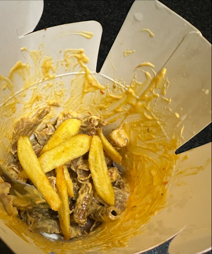 Der Hähnchen- Döner war kalt , bestand aus einem verbrannten Brot mit säuerlichem Kraut, etwas Zwiebeln und 3 Stückchen von eventuell Hähnchenfleisch.
