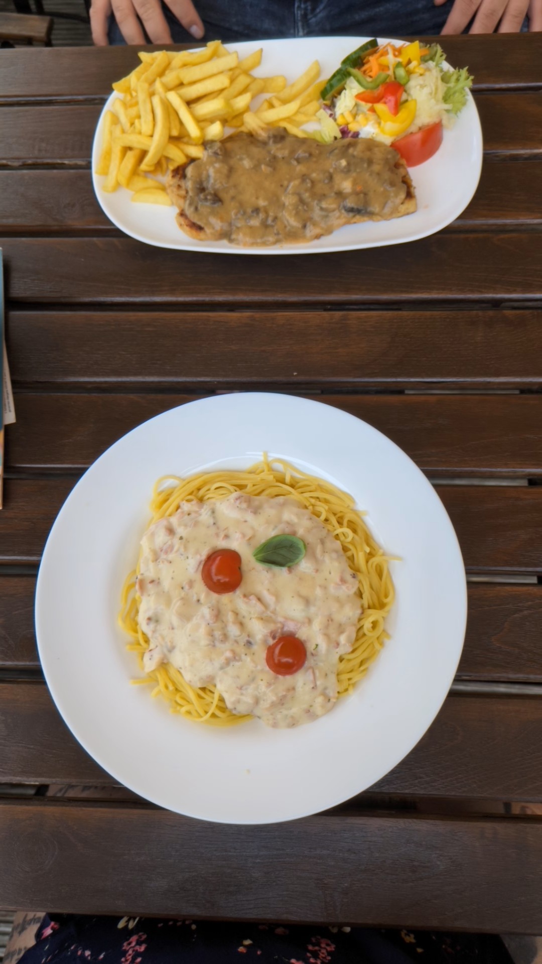 Großer Pluspunkt: Hier bekommt man noch Bratkartoffeln! Allerdings fehlte bei unserem Besuch etwas Entscheidendes – der Buttergeschmack, der für richtige Bratkartoffeln einfach dazugehört. Ich hatte Matjes mit Bratkartoffeln. Die Portion war okay, die Matjesfilets waren aufgeteilt, sodass es etwas mehr wirkte. Leider fehlte die Remoulade, wodurch das Gericht insgesamt etwas trocken wirkte. Meine Bewertung dafür: 6 von 10. Meine Frau hatte ein Jägerschnitzel mit Pilzsauce, ebenfalls mit Bratkartoffeln – das war deutlich runder und bekommt von uns 8 von 10 Punkten.