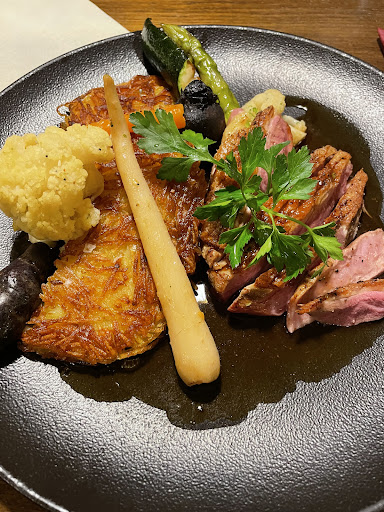 Kulinarisch hat uns dieser Besuch erneut überzeugt: Als Vorspeise hatten wir das Tatar mit Wurzelbrot – fein abgeschmeckt und optisch ansprechend angerichtet. Der Zwiebelrostbraten war auf den Punkt gegart, die Zwiebeln schön karamellisiert, und das Fleisch wunderbar zart. Als Dessert rundete das Eis aus weißer Schokolade auf Pistaziencreme den Abend geschmackvoll ab – eine kreative Kombination. Dazu gab es sogar eine „Schnee-Maß“, die das Erlebnis augenzwinkernd abrundete.
