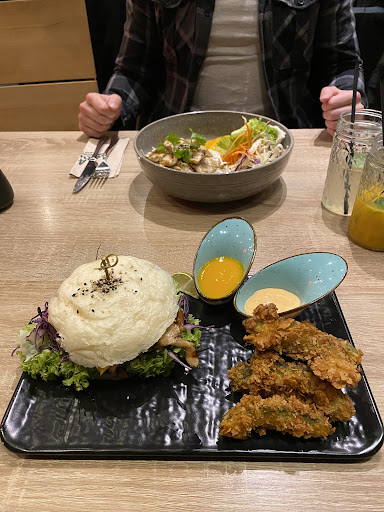 Read moreIch und meine 2 Freundinnen haben gestern Abend hier gegessen und waren sehr zufrieden. Meine Erwartung war echt sehr groß (da ich dieses Restaurant von der Sendung „Mein Lokal, dein Lokal“ gesehen habe), wurde aber erfüllt. Als wir der Raum getreten haben, der sah sehr authentisch und modern aus, schön klein aber sehr fein. Man fühlt sich wohl da. Der Laden war ziemlich voll, als wir ankamen (reservieren wäre am besten denke ich). Dann haben wir die Karte bekommen. Erwartet nicht auf gebratene Nudel oder was in China Imbiss gib, es ist eine Fusion Küche!!! Getränke: ich hatte die Hausgemachte Limonaden Holla Minze, owh yuuummmm… Sehr Lecker! Meine Freundinnen hatte Chia-Zitrus und Koriander Mule, die fanden auch gut. Also, ich hatte Sommerrollen mit Garnelen als Vorspeise, Bome Bao Burger mit Surimi Tempura als Hauptspeise und Eis Trio als Nachtisch. Sommerrollen mit Garnelen: da ich Asiatin bin, kann ich auch diese Rolle selber machen. ABER, die Soße zum Dippen!!! Geil! Voll Lecker! Besser geht nicht! Also Tip Top, ist ein „it’s a MUST to have!“ Bome Bao Burger: Wir dürfen das nicht sowie normale Hamburger vorstellen. Ich bin kein großer Fan von Hamburger eigentlich, abeeerrr… Die Brötchen liebe ich, es ist sowie ein Bakpao in meiner Heimat. Ich kenne diese Brötchen, deshalb bin ich gekommen, ganz schön soft ist die. Das Hähnchen war zart. Und die Soße, I LOVE YOU BOME! Diese Käse Wasabi-Mayo und Mango Soße kann ich darin schwimmen. Für mich ist nicht scharf. Ich übertreibe? Ja bin ich, aber egal. Das war einfach gut. Ich hatte Surimi Tempura als Beilage, schön knusprig und innen soft. Wenn man Surimi kennt, braucht man nicht mehr erklären wie die schmecken. Dieses Gericht werde ich immer wieder bestellen. Das war ein dünnes Haar auf dem Essen, aber ich werde nicht davon sterben. Das war seeehhrr dünn, fast kaum zu sehen. Es kann aber passieren! Mit dem Geschmack kann ich alles auf dieser Welt verzeihen. Eis Trio: wenn man Mochis kennt und mag, dann liebt man dieses Eis. Und ich kenne und liebe Mochis. Es gab Sesame Eis, Mango Eis und Matcha Eis und alle drei waren seeehhhrrr gut! Am liebsten Matcha und Mango Eis, den Geschmack sind die nicht sowie das Eis im Laden oder beim Asia AYCE Restaurant. Meine zwei Freundinnen hatte Miso Suppe Klassik und Miso Suppe Lachs als Vorspeise, Bowl der Saison und Beef Teriyaki Bowl als Hauptspeise. Ich durfte die alle auch probieren. Die Miso finde ich sehr gut, von der Farbe ist dunkler als normale Miso Suppe, aber Geschmack war gut. Nur eine Suppe war nicht so heiß, aber das kann ja passieren. Die Bowls finde ich auch lecker, besonders mit Teriyaki war klasse! Danach hatten wir zum Schluss heiße Getränke: Vietnamese Coffee mit gesüßter Milch, Vietnamese Iced Coffee mit gesüßter Milch (hab leider kein Foto gemacht) und Frische Minze- Limette- Honig Tee. Ein gelungener Abend! Service: war gut, zügig und nett! Er erklärte auch gerne die Sachen, falls man fragt. Ich habe in der Bewertung gelesen, dass die Wartezeit sehr lange sein sollte. Aber gestern fand ich OK und angemessen, obwohl es voll war, als wir ankamen. Wir haben direkt Getränke, Vorspeise und Hauptspeise bestellt, Nachspeise nachdem Hauptspeise. Insgesamt waren wir sehr zufrieden und mit glücklichem vollem Bauch nach Hause gefahren. Ich werde bestimmt, auf jeden Fall und natürlich wiederkommen. Ich möchte andere Gerichte probieren und dort gut gehenlassen. Remember : Fusion Küche! Man erlebt hier andere Dimensionen von asiatischem Essen mit leckerem, modernem und hoch qualitativem Geschmack. Guten Appetit und bis zum nächsten Mal. Na toll, jetzt hab...