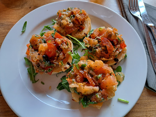 Good variety of plates ranging from basics like pasta and pizza to Mediterranean grilled meat dishes, seafood, and schnitzel plus seasonal specialities. Slightly expensive (€9.50+ for pizza, €18 for shrimp) but decent-sized portions, tasty, and presented nicely. Indoor, outdoor patio, and indoor winter garden seating with a small parking lot in back. Hot-and-cold service: there is an extremely friendly blonde woman who made us feel very welcome and then a middle-aged man that is her polar opposite. He would speak brusquely and instead of walking around the table to serve or remove dishes, would rudely and excessively lean over the table and hand dishes hanging mid-air to our party, and nearly spilled things on us as he...