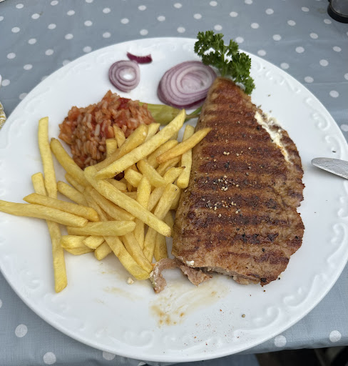 Essen nicht durchgängig zu empfehlen: Zwiebelsuppe sehr gut, Schnitzel Wiener Art absolut einfach, aber noch okay, der Grillteller mit 3 verschiedenen Fleischsorten misslungen, weil alle 3 Fleischsorten furchtbar trocken und "totgebraten". Recht unangenehm auch der Hackbraten mit Fetakäse gefüllt, weil sogar das Hackfleisch so trocken und gepresst ankam, dass es schwer zu schneiden war (!), am schlimmsten der "Fischsalat": einige lieblos drapierte Salatblätter, kaum Soße und je ein Löffel zerquetsche Sardinen aus der Dose (!) und ein Löffel Thunfisch aus der Dose, einfach enttäuschend. Auf Nachfrage kam dann sofort Essig und Öl, damit nachgearbeitet, Küchenniveau also insgesamt zuemlich anspruchslos und traurig.