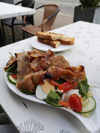 Es gab den Salat des Hauses und das war gleich die erste Überraschung: Einen solchen Salat habe ich noch nirgendwo gesehen. Wer jetzt viel grünen Salat erwartet, muss sich da gleich mal umstellen. Natürlich war Rucola drin, in diesem Restaurant ist alles nur vom Besten. Aber es gab auch reichlich Kochschinken, Tomaten, Gurken, Paprika, Ananas, Eier und vieles mehr. Obendrauf war der Salat mit einer Schicht Dönerfleisch abgedeckt, darunter der Salat mit perfektem Dressing abgeschmeckt. Dazu wurde frisch geröstetes Brot gereicht.